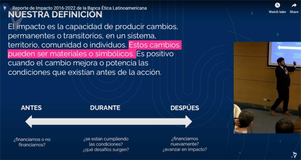 Los dos primeros, la cartera de créditos y su evolución, el perfil de las empresas que han recibido los créditos, ambos detallados por Jorge Muñoz, gerente general de Doble Impacto; un tercer ámbito que es el perfil de los inversionistas quienes han hecho posible financiar a estas organizaciones, explicado por María Fernanda Cerda, subgerenta comercial de Inversiones, y los indicadores de impacto, mostrados por Sebastián Cantuarias, director ejecutivo de Banca Ética Latinoamericana.